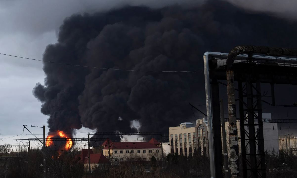Το δημοτικό συμβούλιο ανέφερε αργότερα ότι καίγονται πετρελαιοειδή μετά τη ρωσική επίθεση.
