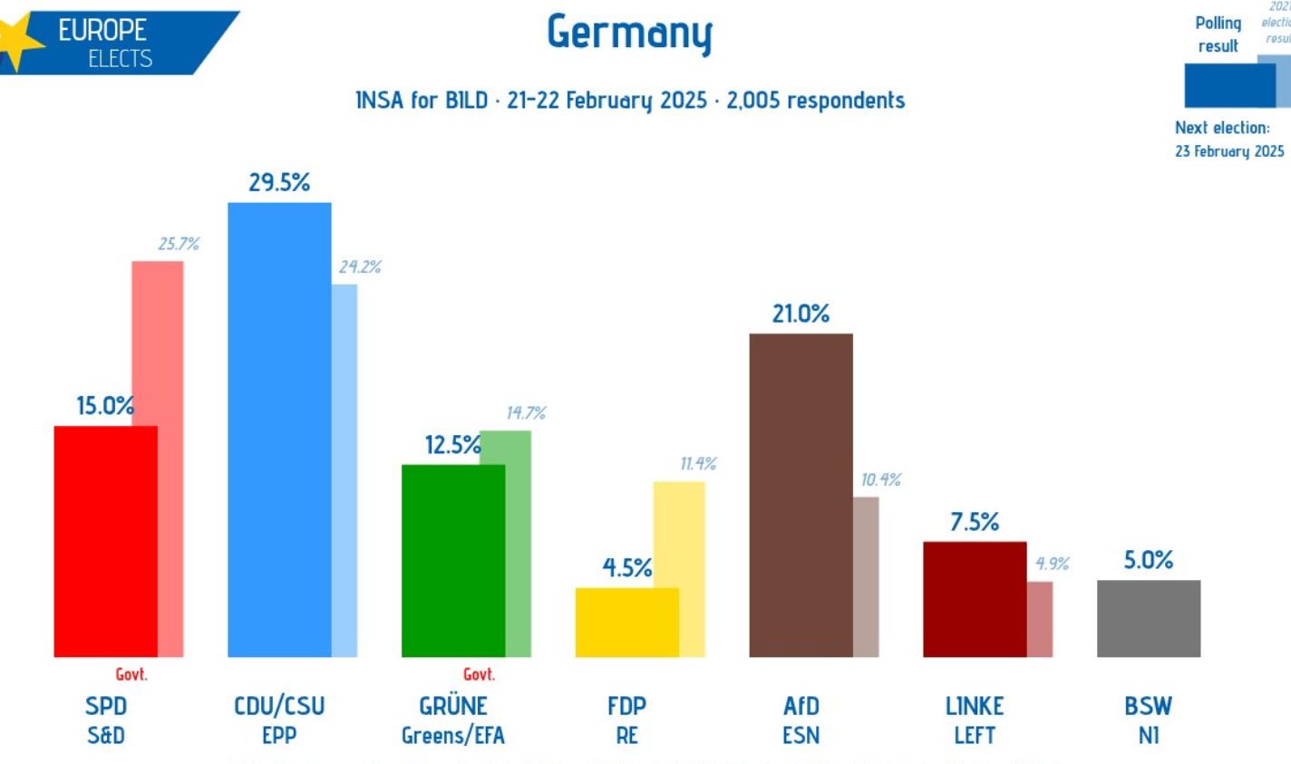 Κατά τη διάρκεια της προεκλογικής εκστρατείας, ούτε οι Σοσιαλδημοκράτες (SPD) του Scholz ούτε οι Πράσινοι με επικεφαλής τον υπουργό Οικονομίας Robert Habeck απέσπασαν μεγάλη δυναμική, καθώς και οι δύο φέρουν ευθύνη για την γερμανική οικονομία και τα εγκληματικά γεωπολιτικά λάθη, που οδήγησαν τη Γερμανία σε αποβιομηχάνιση.