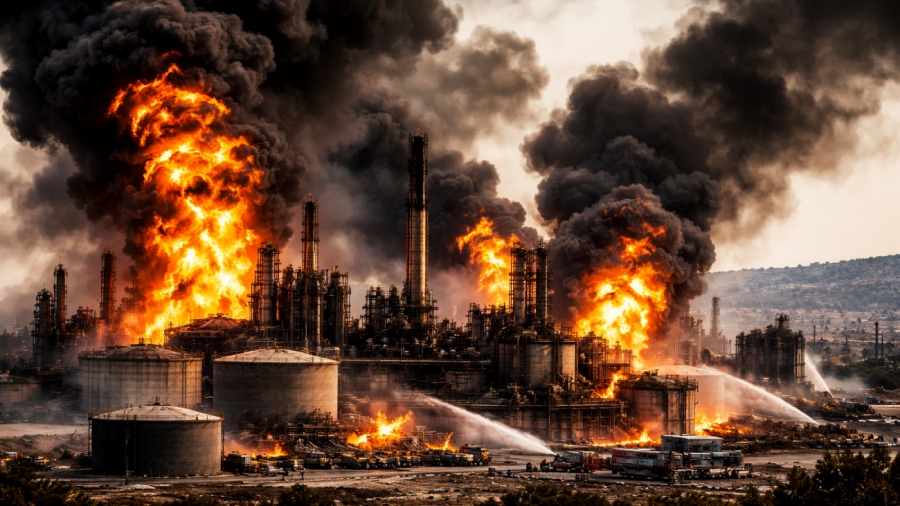 Οπτικό υλικό που διαμοιράζεται ευρέως στο διαδίκτυο δείχνει φλόγες να… καταπίνουν μια τεράστια δεξαμενή αποθήκευσης στο διυλιστήριο πετρελαίου Bazan, με πυκνό μαύρο καπνό να υψώνεται στον ουρανό.